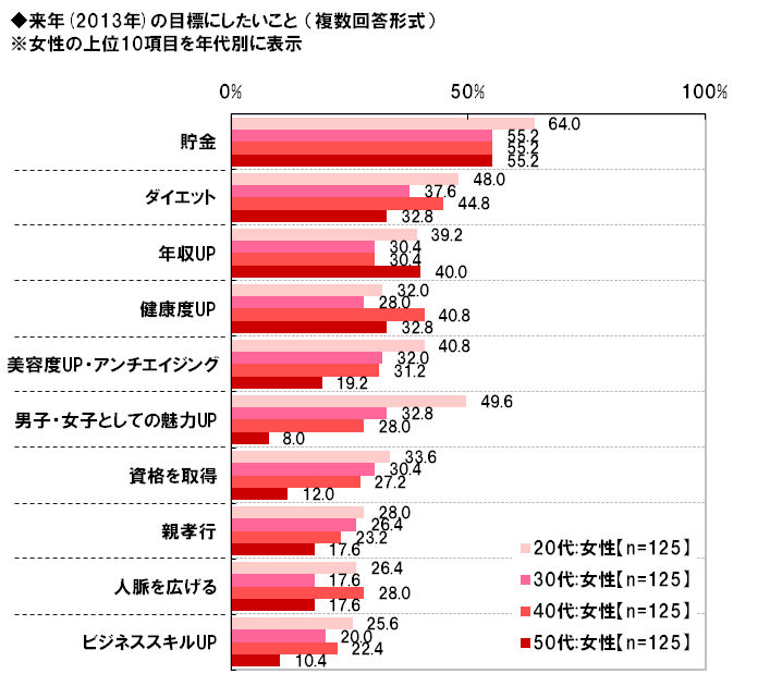 男女別にみると、男性の方が女性より多く挙がった目標は、「年収UP」(男性41.2%、女性35.0%)で、特に20代男性では52.0%と半数強となりました。他方、女性の方が多く挙がった目標は多く、特に男女間の開きが大きかった目標は「貯金」(男性36.6%、女性57.4%)、「美容度UP・アンチエイジング」(男性3.8%、女性30.8%)、「ダイエット」(男性23.2%、女性40.8%)でした。