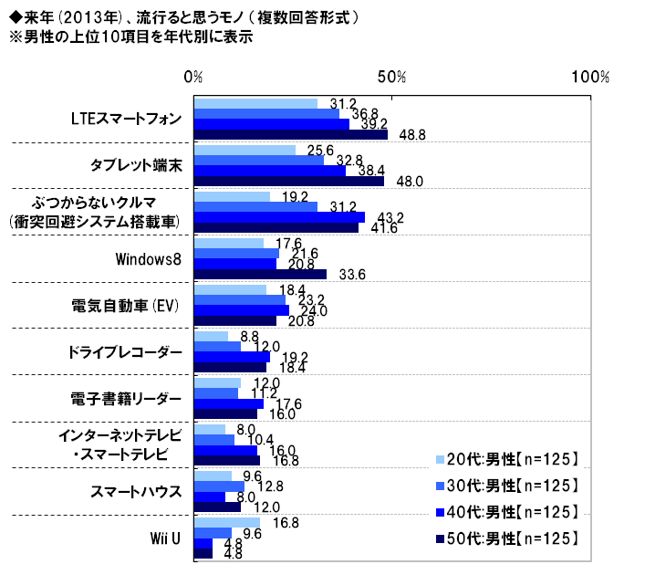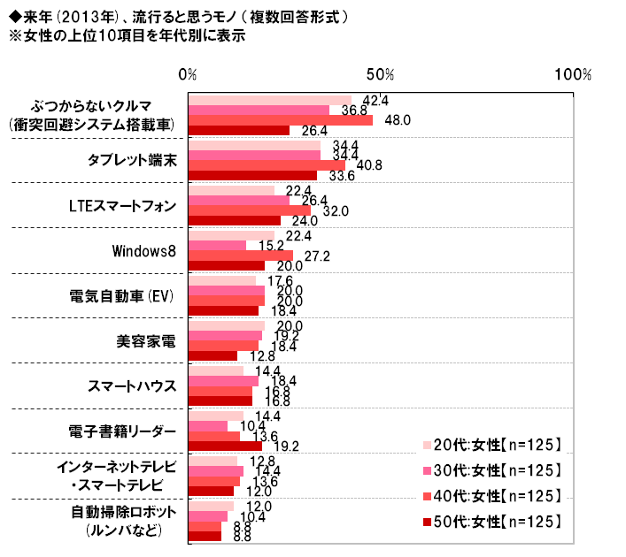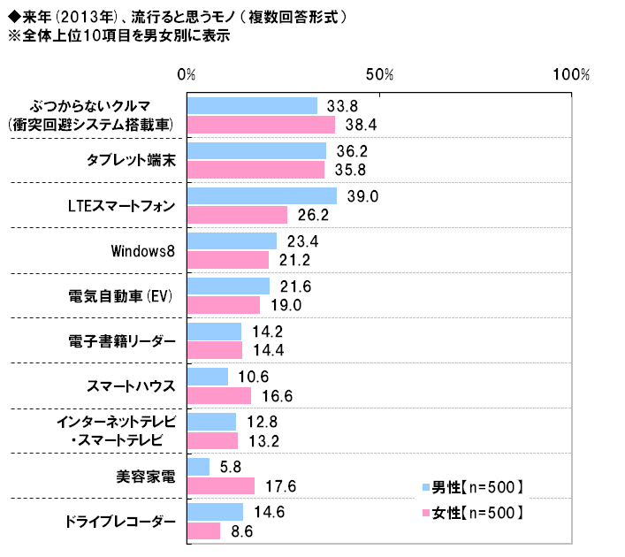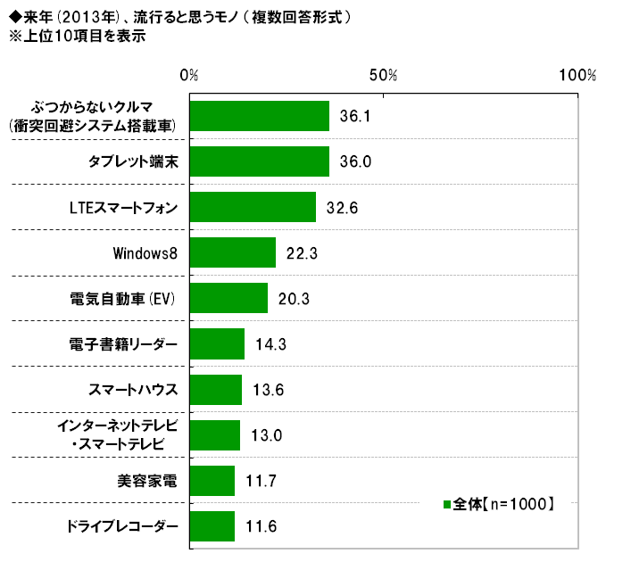 来年(2013年)どのようなモノが流行ると思われているのかをみると、最多は「ぶつからないクルマ(衝突回避システム搭載車)」36.1%、ほぼ同率で「タブレット端末」36.0%となり、以下、「LTEスマートフォン」32.6%、「Windows8」22.3%、「電気自動車(EV)」20.3%の順で続きました。