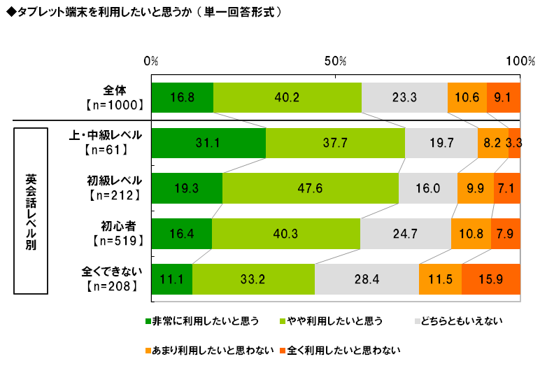 これを英会話レベルの切り口でみると、英会話レベルが上がるほどタブレット端末の利用意向率が高くなり、上・中級レベル(ネイティブ・日常会話が可能レベル)では68.8%と約7割に達し、全体より10ポイント以上高い結果となりました。その他のレベルでは、初級レベル(簡単な会話が可能レベル)66.9%、初心者(わかる単語があるレベル)56.7%、全くできない44.3%となりました。