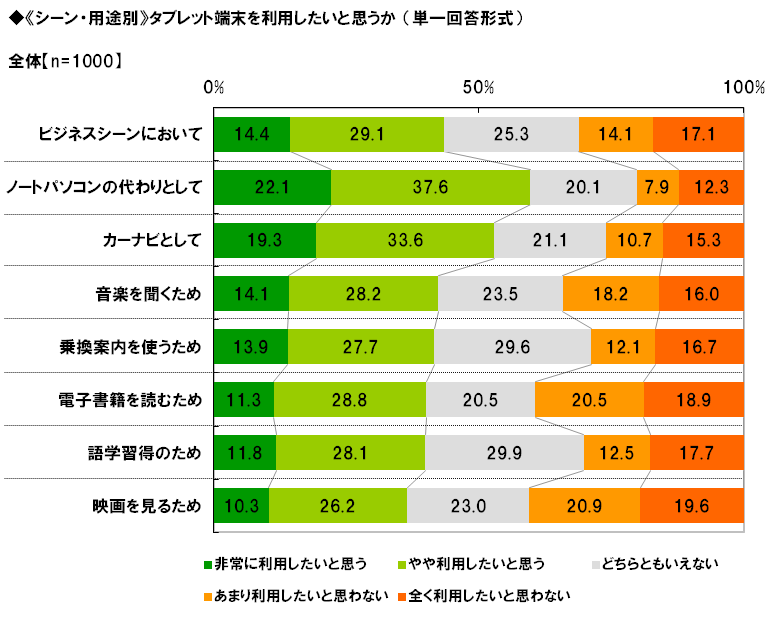 利用意向についてみると、ビジネスパーソンのタブレット端末の利用意向率は6割近くになり、用途・シーン別にみると、《ノートパソコンの代わり》や《カーナビとして》の利用意向率が半数を超えており、タブレット端末をこれらの代わりとして捉えている様子が窺えました。タブレット端末は持ち運びがしやすく、様々な用途に使えるため、今後、ビジネスパーソンが外出先や出張先で利用する機会が増えるかもしれません。
