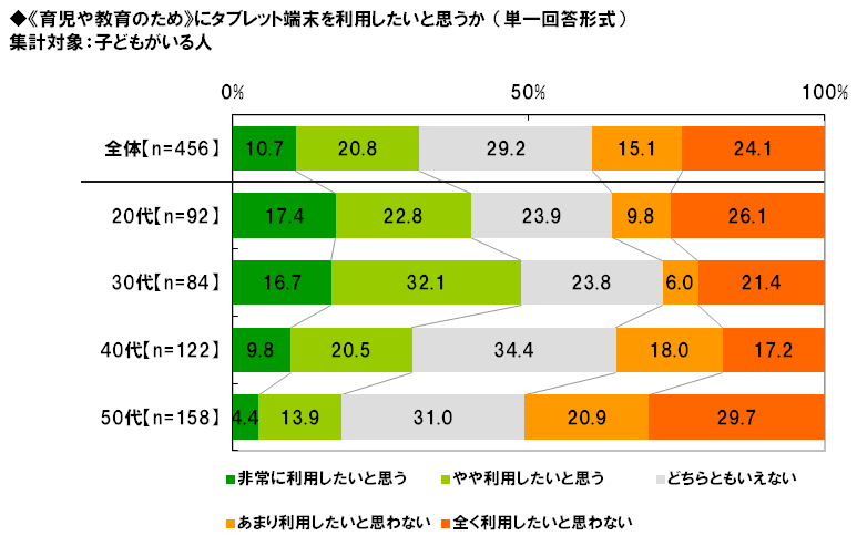 ◆パパ・ママの育児・教育目的でのタブレット端末利用意向 30代では半数近く グラフ27