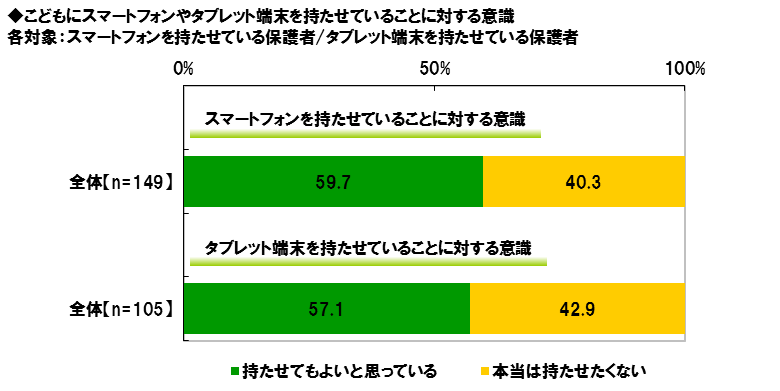 次に、スマートフォンやタブレット端末を持たせている保護者の意識をみると、【スマートフォン】では、「持たせてもよいと思っている」59.7%、「本当は持たせたくない」40.3%となり、【タブレット端末】では、「持たせてもよいと思っている」57.1%、「本当は持たせたくない」42.9%となりました。