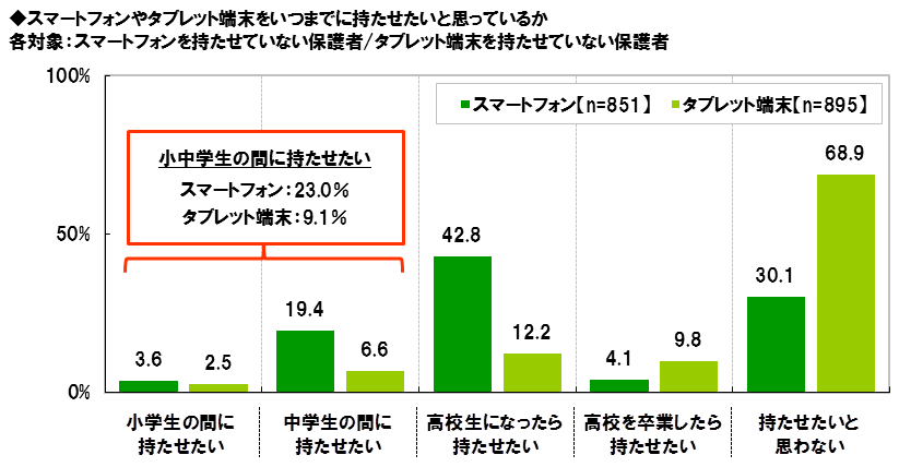 また、持たせていない保護者の意識(いつまでに持たせたいと思っているか)をみると、【スマートフォン】では、「高校生になったら持たせたい」が最も多く42.8%で、『小中学生の間に持たせたい』(「小学生の間に持たせたい」と「中学生の間に持たせたい」の合計)は23.0%、【タブレット端末】は、『小中学生の間に持たせたい』が9.1%でした。