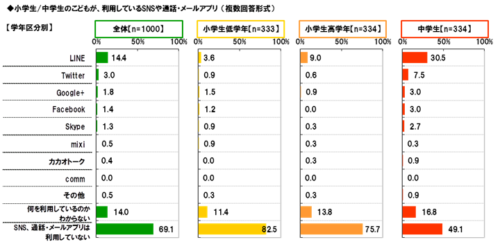 全回答者(1,000名)に、自身の小中学生のこどもが利用しているSNSや通話・メールアプリを聞いたところ、最も多かったのは「LINE」14.4%で、次いで、「Twitter」3.0%、「Google+」1.8%、「Facebook」1.4%、「Skype」1.3%が続きました。また、「何を利用しているのかわからない」は14.0%、「SNS、通話・メールアプリは利用していない」は69.1%でした。
