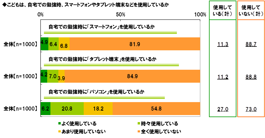 全回答者(1,000名)に、こどもが自宅での勉強時にスマートフォンやタブレット端末を使用しているか聞いたところ、全体では、『使用している』(「よく使用している」と「時々使用している」の合計、以下同様)割合は、【スマートフォン】では11.3%、【タブレット端末】では11.2%でした。また、【パソコン】についても聞いたところ、『使用している』は27.0%でした。