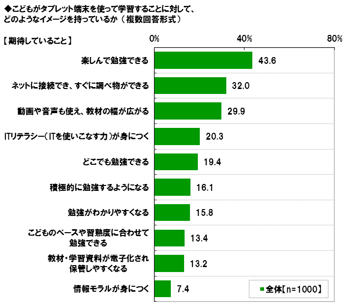 そこで、全回答者(1,000名)に、こどもがタブレット端末を使って学習することに対して、どのようなイメージを持っているか聞いたところ、【期待していること】としては、「楽しんで勉強できる」43.6%が最も多く、「ネットに接続でき、すぐに調べ物ができる」32.0%、「動画や音声も使え、教材の幅が広がる」29.9%、「ITリテラシー(ITを使いこなす力)が身につく」20.3%が続きました。
