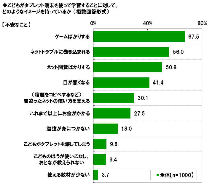 タブレット学習の不安 「ゲームばかり」「ネットトラブル」「ネット閲覧ばかり」が半数以上