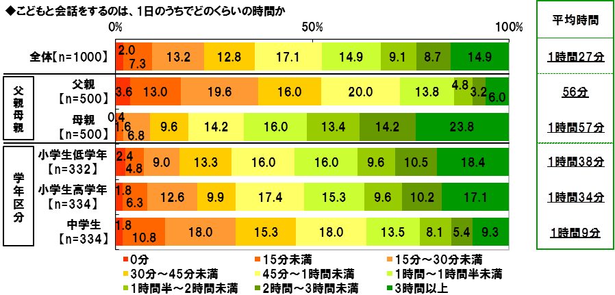 全回答者(1,000名)に、こどもと会話をするのは、1日のうちどのくらいの時間か聞いたところ、「15分~30分未満」13.2%、「30分~45分未満」12.8%、「45分~1時間未満」17.1%、「1時間~1時間半未満」14.9%となり、平均時間は1時間27分となりました。父親と母親それぞれについてみると、平均時間は、父親では56分、母親では1時間57分となり、母親のほうが1時間長くコミュニケーションをとっている結果となりました。また、こどもの学年区分別に平均時間をみると、小学生低学年(1~3年)の保護者では1時間38分、小学生高学年(4~6年)の保護者では1時間34分と1時間半以上となりましたが、中学生の保護者では1時間9分でした。