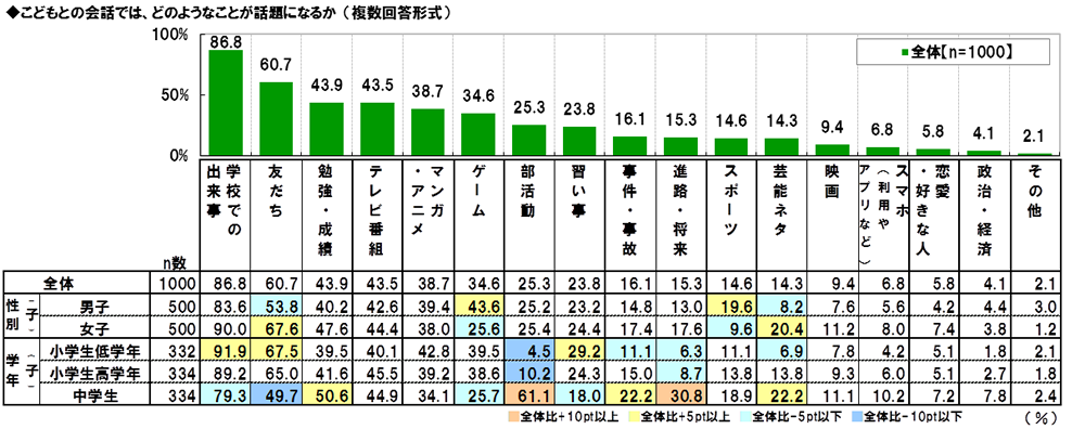 こどもとの会話の話題 トップは「学校での出来事」、「テレビ番組」は4割強、「マンガ・アニメ」は4割弱