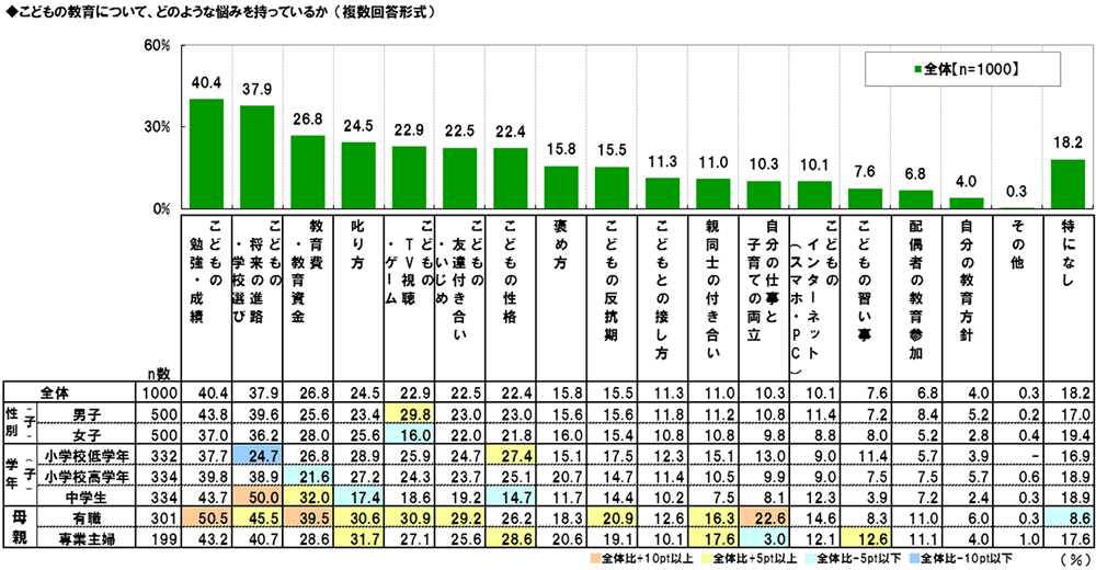 全回答者(1,000名)に、こどもの教育について、どのような悩みを持っているか聞いたところ、「こどもの勉強・成績」40.4%が最も多く、次いで「こどもの将来の進路・学校選び」37.9%が3割台、「教育費・教育資金」26.8%、「叱り方」24.5%、「こどものTV視聴・ゲーム」22.9%、「こどもの友達付き合い・いじめ」22.5%、「こどもの性格」22.4%が2割台で続きました。