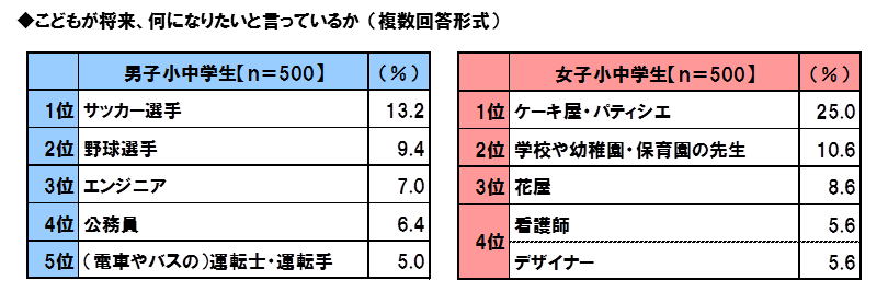全回答者(1,000名)に、こどもは将来、何になりたいと言っているか聞いたところ、男子小中学生では、1位「サッカー選手」(13.2%)、2位「野球選手」(9.4%)、3位「エンジニア」(7.0%)、4位「公務員」(6.4%)、5位「(電車やバスの)運転士・運転手」(5.0%)となり、女子小中学生では、1位「ケーキ屋・パティシエ」(25.0%)、2位「学校や幼稚園・保育園の先生」(10.6%)、3位「花屋」(8.6%)、4位「看護師」「デザイナー」(ともに5.6%)となりました。