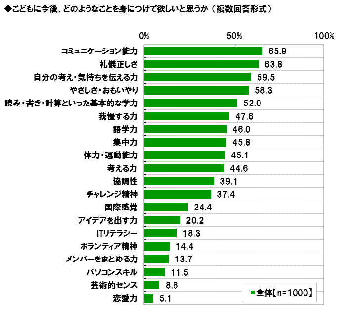 全回答者(1,000名)に、こどもに今後、どのようなことを身につけて欲しいと思うか聞いたところ、最も多かったのは「コミュニケーション能力」65.9%で、僅差で「礼儀正しさ」63.8%が続き、以下、「自分の考え・気持ちを伝える力」59.5%、「やさしさ・おもいやり」58.3%、「読み・書き・計算といった基本的な学力」52.0%が半数以上で続きました。また、「国際感覚」は24.4%と保護者の4人に1人が、身につけて欲しいと思うことに挙げました。