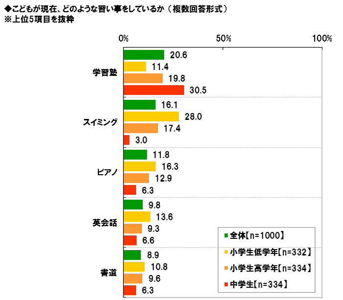 そして、全回答者(1,000名)に、こどもが現在、どのような習い事をしているか聞いたところ、「学習塾」20.6%、「スイミング」16.1%、「ピアノ」11.8%、「英会話」9.8%、「書道」8.9%が上位5項目となりました。