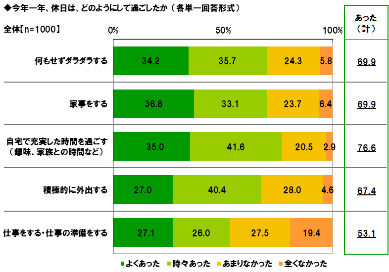 全国の20歳~59歳の男女ビジネスパーソン 1,000名(全回答者)に、今年一年の休日は、どのようにして過ごしたかを聞いたところ、『あった(計)』(「よくあった」と「時々あった」の合計)は、「何もせずダラダラする」69.9%、「家事をする」69.9%、「自宅で充実した時間を過ごす(趣味、家族との時間など)」76.6%となりました。