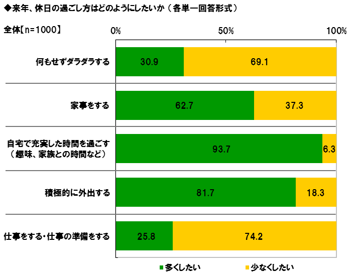 また、来年の休日の過ごし方はどのようにしたいか聞いたところ、「自宅で充実した時間を過ごす(趣味、家族との時間など)」(多くしたい 93.7%)、「積極的に外出する」(多くしたい 81.7%)では大多数のビジネスパーソンが「多くしたい」と回答し、「家事をする」(多くしたい 62.7%)でも過半数が「多くしたい」としました。