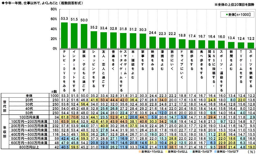全回答者(1,000名)に、今年一年間、仕事以外でどのようなことをよくしたか聞いたところ、最も多かったのは「テレビ・DVDをみる」で53.3%、次いで、「インターネットをする」51.5%、「家族・子どもと過ごす」50.0%が続きました。