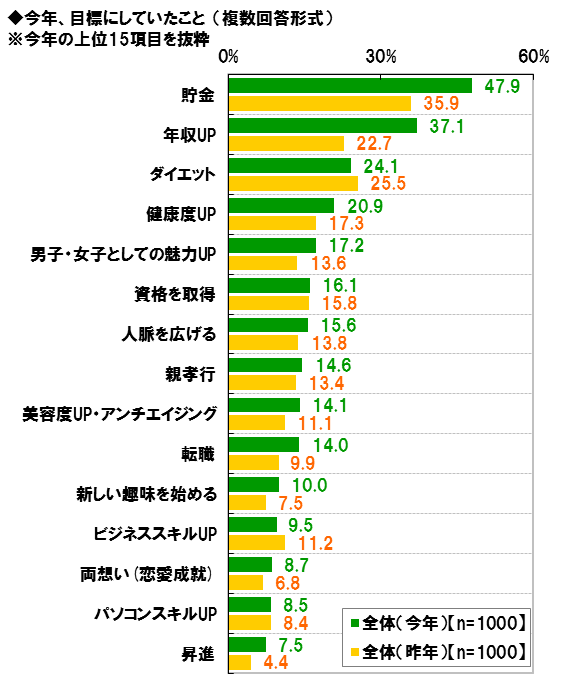 昨年の調査結果(※)と比べると、「貯金」(昨年35.9%、今年12.0ポイント上昇)と「年収 UP」(昨年22.7%、今年14.4ポイント上昇)は、10ポイント以上の上昇という結果となりました。