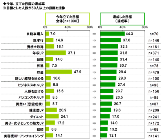 ビジネスパーソンが今年立てた目標の上位3つは、「貯金」、「年収UP」、「ダイエット」でした。昨年の調査でも同じ項目が上位3つでしたが、今年は、「貯金」と「年収UP」を目標に立てた人の割合は、昨年よりも10ポイント以上も上昇しました。これが、景気回復を実感できたことによって立てられた目標なのか、それとは逆に、厳しさを感じているからこそ目標に立てたのか、興味深いところです。
