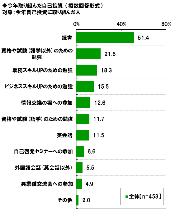 自己投資に取り組んだ453名に、どのようなことに取り組んだのかを聞いたところ、「読書」51.4%が際立って高くなりました。読書に続いたのは、「資格や試験(語学以外)のための勉強」21.6%、「業務スキルUPのための勉強」18.3%、「ビジネススキルUPのための勉強」15.5%、「情報交換の場への参加」12.6%、「資格や試験(語学)のための勉強」11.7%、「英会話」11.5%でした。