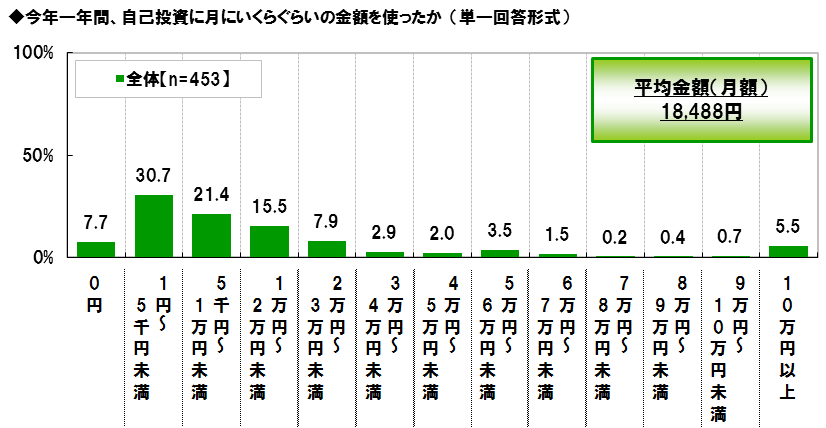 また、同じ453名に、ひと月の自己投資額(※)を聞いたところ、「1円~5千円未満」30.7%、「5千円~1万円未満」21.4%、「1万円~2万円未満」15.5%となり、平均は18,488円でした。