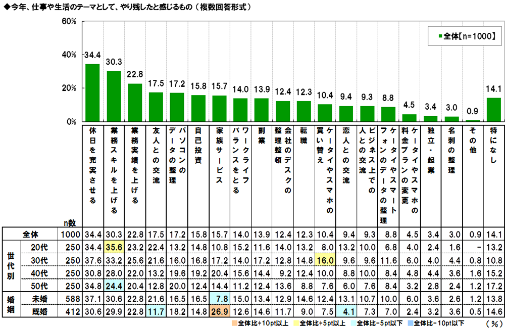 ◆ビジネスパーソンが今年やり残したこと 「休日の充実」、「業務スキル UP」、「業務実績 UP」