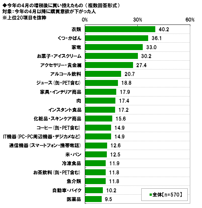 次に、購買意欲が下がった570名が、今年の4月以降に買い控えたものをみると、最も多かったのは「衣類」で 40.2%、次いで、「くつ・かばん」が 36.1%でした。