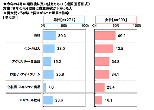 女性は「美容・ファッション関連」と「お菓子」、男性は「アルコール飲料」を買い控え