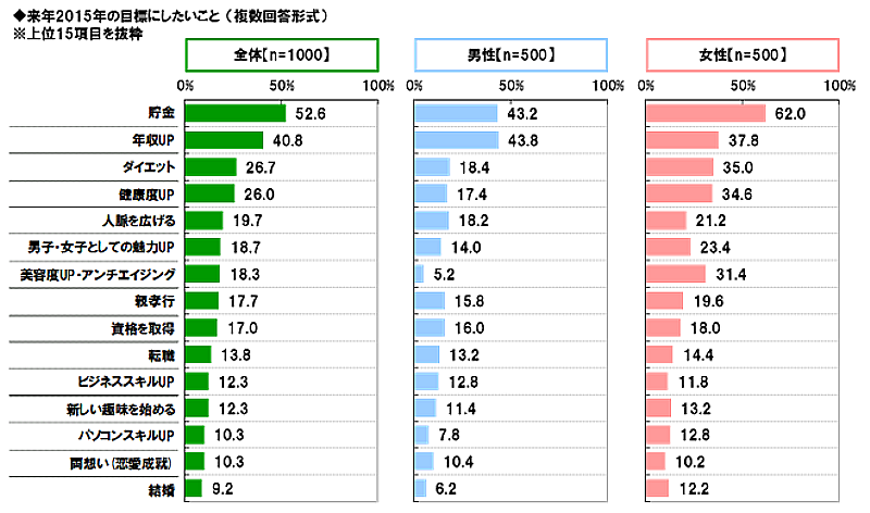 全回答者(1,000名)に、来年2015年の目標にしたいことを聞いたところ、「貯金」52.6%が最も多く、次いで、「年収 UP」40.8%、「ダイエット」26.7%、「健康度 UP」26.0%、「人脈を広げる」19.7%が続きました。