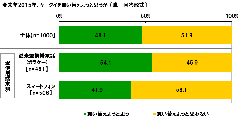 全回答者(1,000名)に、来年2015年、ケータイを買い替えようと思うか聞いたところ、「買い替えようと思う」48.1%、「買い替えようと思わない」51.9%と、買い替え意向あり派となし派が拮抗する結果となりました。
