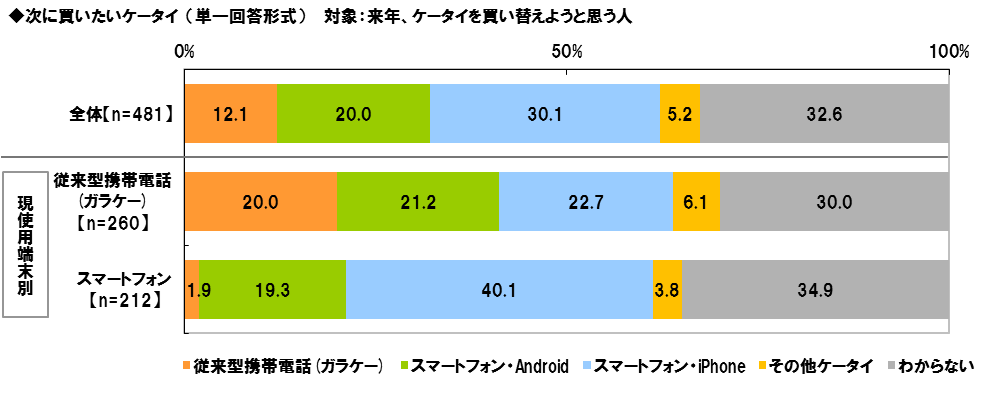買い替え意向のある481名に、次はどのようなケータイにしたいか聞いたところ、「従来型携帯電話(ガラケー)」12.1%、「スマートフォン・Android」20.0%、「スマートフォン・iPhone」30.1%となりました。