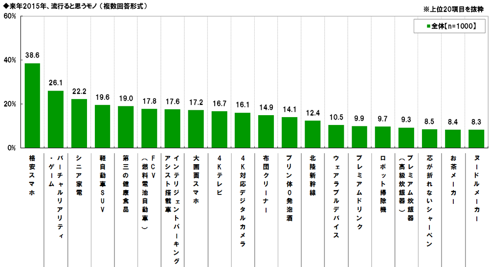 全回答者(1,000名)に、来年2015年に流行ると思うモノを聞いたところ、1位は「格安スマホ」(38.6%)、2位「バーチャルリアリティ・ゲーム」(26.1%)、3位「シニア家電」(22.2%)、4位「軽自動車 SUV」(19.6%)、5位「第三の健康食品」(19.0%)となりました。