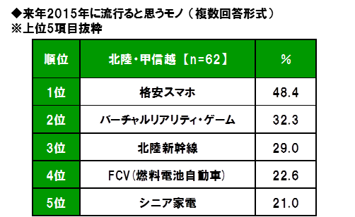 また、来年3月14日に開業が予定されている「北陸新幹線」は全体では12.4%でしたが、北陸・甲信越に限ってみると29.0%と約3割になり、「格安スマホ」(48.4%)、「バーチャルリアリティ・ゲーム」(32.3%)に次いで3位となりました。