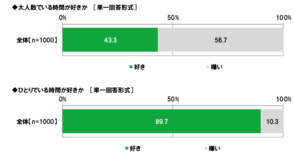 まず、大人数でいる時間が好きかを聞いたところ、「好き」は43.3%、「嫌い」は56.7%となりました。
