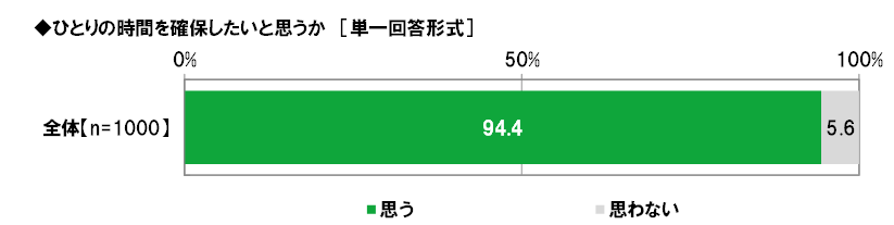 また、ひとりの時間を確保したいと思うかを聞いたところ、「思う」は94.4%、「思わない」は5.6%となりました。 ビジネスパーソンの大多数が、職場の人や家族などと過ごす時間とは別に、自分ひとりで過ごす時間を持ちたいと考えているようです。