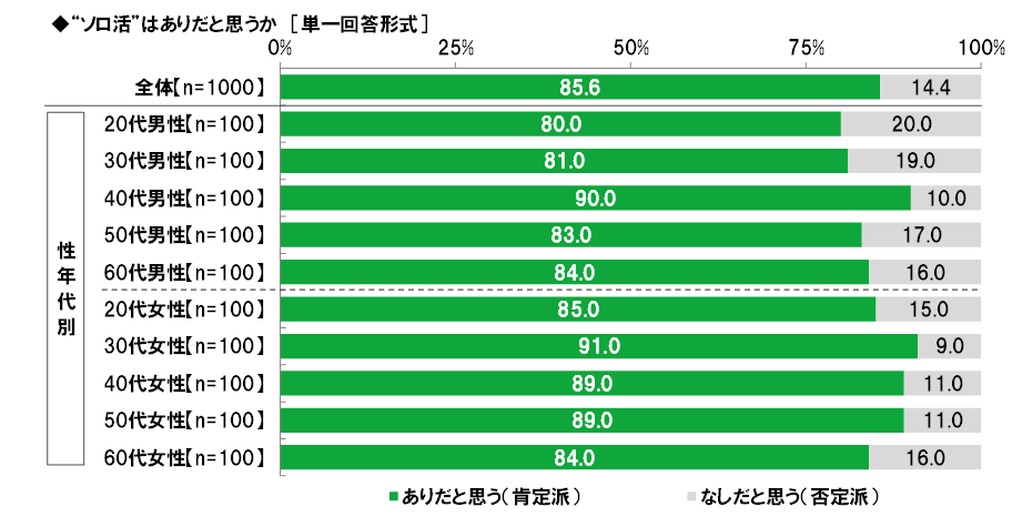 まず、全回答者(1,000名)に、“ソロ活”はありだと思うか(肯定的にとらえているか)を聞いたところ、「ありだと思う(肯定派)」は85.6%、「なしだと思う(否定派)」は14.4%で、ソロ活に肯定的な人が大多数となりました。
