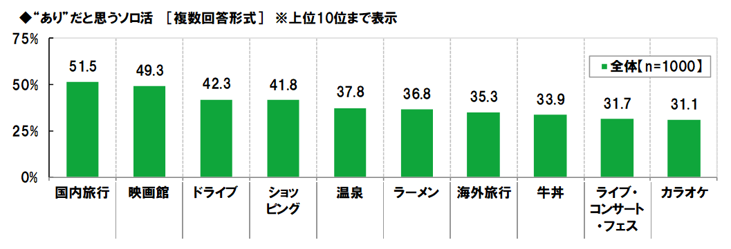 全回答者(1,000名)に、“あり”だと思う(肯定的にとらえている)ソロ活を具体的に聞いたところ、1位「国内旅行」(51.5%)、2位「映画館」(49.3%)、3位「ドライブ」(42.3%)、4位「ショッピング」(41.8%)、5位「温泉」(37.8%)となりました。