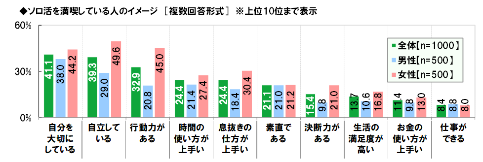 全回答者(1,000名)に、ソロ活を満喫している人のイメージを聞いたところ、1位「自分を大切にしている」(41.1%)、2位「自立している」(39.3%)、3位「行動力がある」(32.9%)、4位「時間の使い方が上手い」「息抜きの仕方が上手い」(いずれも24.4%)となりました。 男女別にみると、「自立している」(男性29.0%、女性49.6%)や「行動力がある」(男性20.8%、女性45.0%)では、男性と比べて女性のほうが20ポイント以上高くなりました。ビジネスウーマンの多くが、“ソロ充”に対し、自身の力で生きる力強さや周囲に流されず自身の考えで動けるタフさを感じているようです。