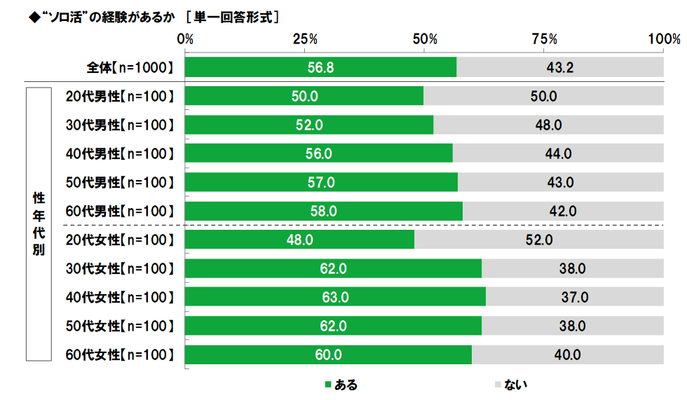 全回答者(1,000名)に、“ソロ活”の経験があるか聞いたところ、「ある」は56.8%となりました。ビジネスパーソンの半数以上が、ソロ活を経験していることが判明しました。