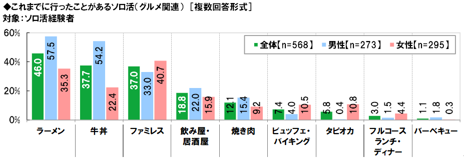 グルメ関連のソロ活をみると、1位「ラーメン」(46.0%)、2位「牛丼」(37.7%)、3位「ファミレス」(37.0%)となりました。