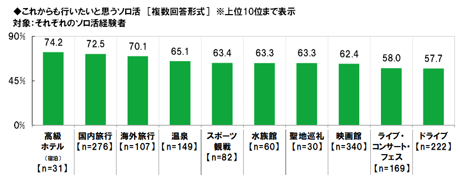それぞれのソロ活経験者に、これからもそのソロ活を行いたいと思うかを聞きました。 これからも行いたい人の割合(リピート意向度)をみると、1位「高級ホテル(宿泊)」(74.2%)、2位「国内旅行」(72.5%)、3位「海外旅行」(70.1%)、4位「温泉」(65.1%)、5位「スポーツ観戦」(63.4%)となりました。「水族館」「聖地巡礼」(いずれも63.3%)や「映画館」(62.4%)も6割以上と高い割合でした。