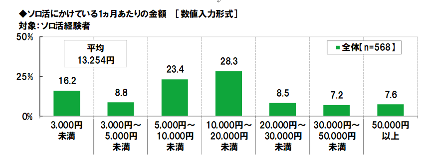 ソロ活経験者(568名)に、ソロ活にかけている1ヵ月あたりの金額を聞いたところ、「10,000円~20,000円未満」(28.3%)や「5,000円~10,000円未満」(23.4%)に回答が集まり、平均額は13,254円となりました。