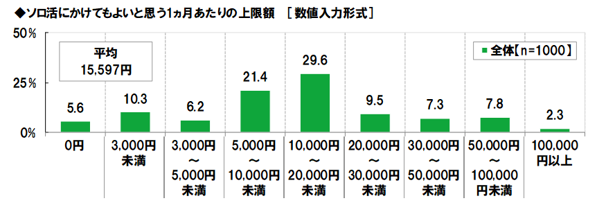 続いて、全回答者(1,000名)に、ソロ活にかけてもよいと思う1ヵ月あたりの上限額を聞いたところ、「10,000円~20,000円未満」(29.6%)に最も回答が集まり、平均額は15,597円となりました。