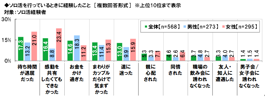 ソロ活経験者(568名)に、ソロ活を行っているときに経験したことを聞いたところ、1位「待ち時間が退屈だった」(17.3%)、2位「感動を共有したくてもできなかった」(16.4%)、3位「お金をかけ過ぎた」(14.6%)、4位「まわりがカップルだらけで気まずかった」(13.4%)、5位「道に迷った」(13.0%)となりました。会話をする相手がいないために、待ち時間を持て余してしまった人が多いようです。また、ソロ活にハマりすぎて散財したり、カップルばかりの場所で気まずさを感じたりといった経験をした人も少なくないようです。