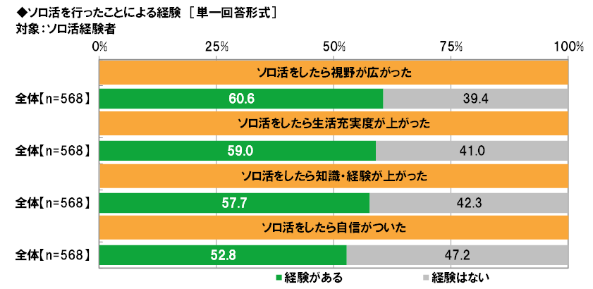 ソロ活経験者(568名)に、ソロ活を行ったことによる経験を聞きました。