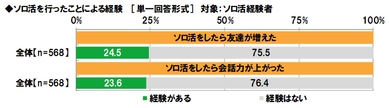 続いて、ソロ活経験者(568名)に、コミュニケーションに関する経験について聞いたところ、経験がある人の割合は、【ソロ活をしたら友達が増えた】では24.5%、【ソロ活をしたら会話力が上がった】では23.6%となりました。ソロ活を行って、人間関係やコミュニケーション力に良い影響があったと感じている人は少なくないようです。