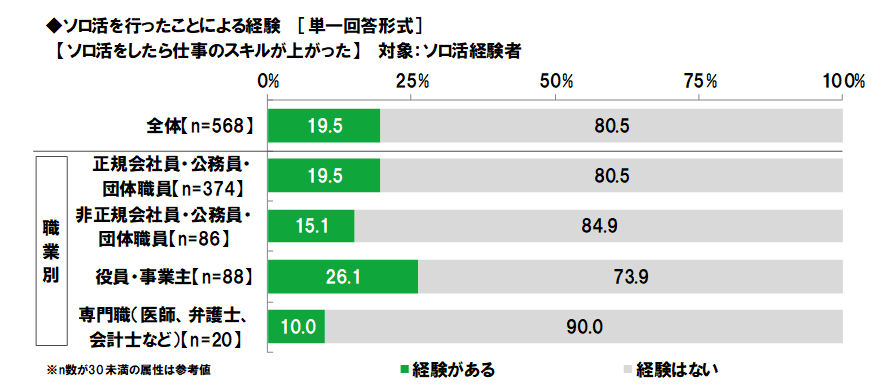 「経験がある」の割合を職業別にみると、役員・事業主では26.1%と、4人に1人の割合になりました。責任のある判断をする機会が多い役員・事業主には、ソロ活が仕事のスキルアップにつながったと実感している人が多いようです。