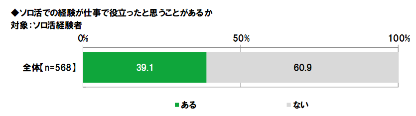 ソロ活経験者(568名)に、ソロ活での経験が仕事で役立ったと思うことがあるか聞いたところ、「ある」は39.1%となりました。