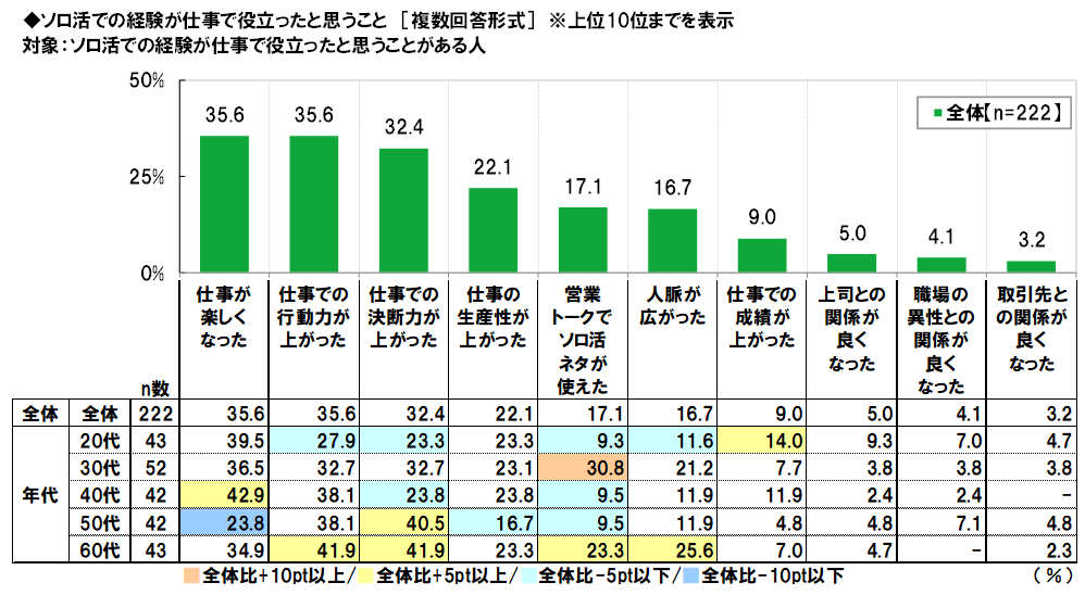 ソロ活での経験が仕事で役立ったと思うことがある人(222名)に、仕事で役立ったと思うことを具体的に聞いたところ、1位「仕事が楽しくなった」「仕事での行動力が上がった」(いずれも35.6%)、3位「仕事での決断力が上がった」(32.4%)、4位「仕事の生産性が上がった」(22.1%)、5位「営業トークでソロ活ネタが使えた」(17.1%)となりました。仕事への取り組み方や、仕事の質に関して、プラスの効果が表れたようです。