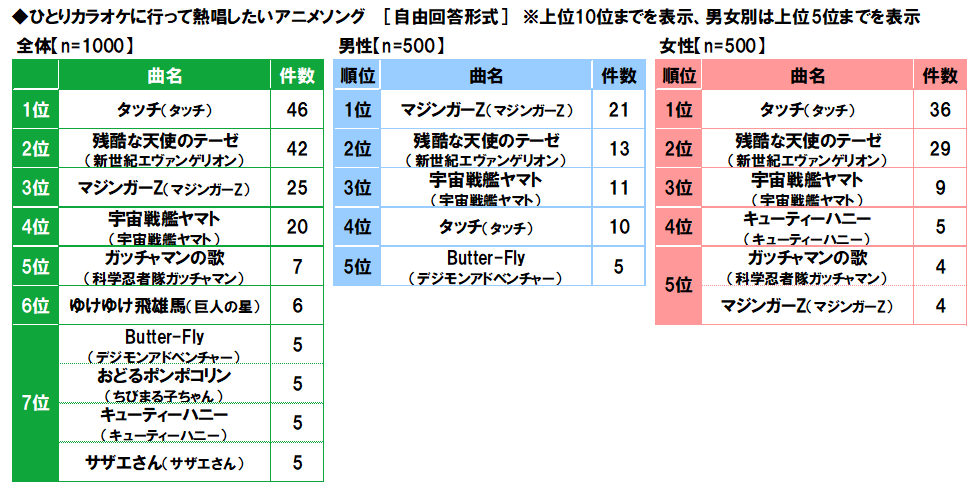 次に、ひとりカラオケに行って熱唱したいアニメソングを聞いたところ、1位「タッチ(タッチ)」、2位「残酷な天使のテーゼ(新世紀エヴァンゲリオン)」、3位「マジンガーZ(マジンガーZ)」となりました。