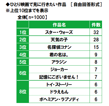 また、ひとり映画で見に行きたい作品を聞いたところ、1位「スター・ウォーズ」、2位「天気の子」、3位「名探偵コナン」となりました。12月に新作が公開される「スター・ウォーズ」や、新海誠監督の最新作「天気の子」を、ひとりでじっくりと鑑賞したい人が多いのではないでしょうか。